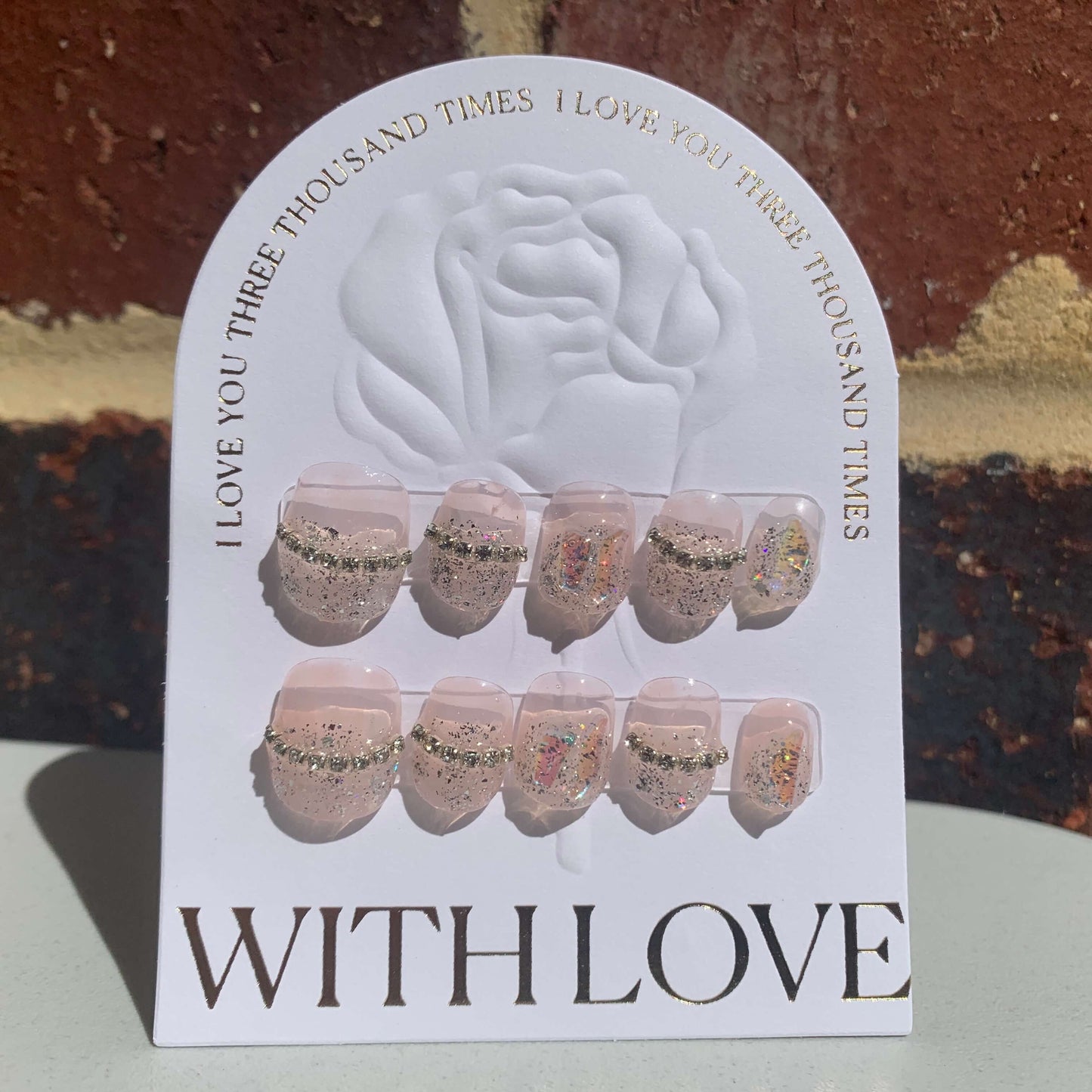 Hand made |  Crushed Sparkle (Embellished with crushed diamonds, transparent pink, glitter) press-on nails and fake nails.