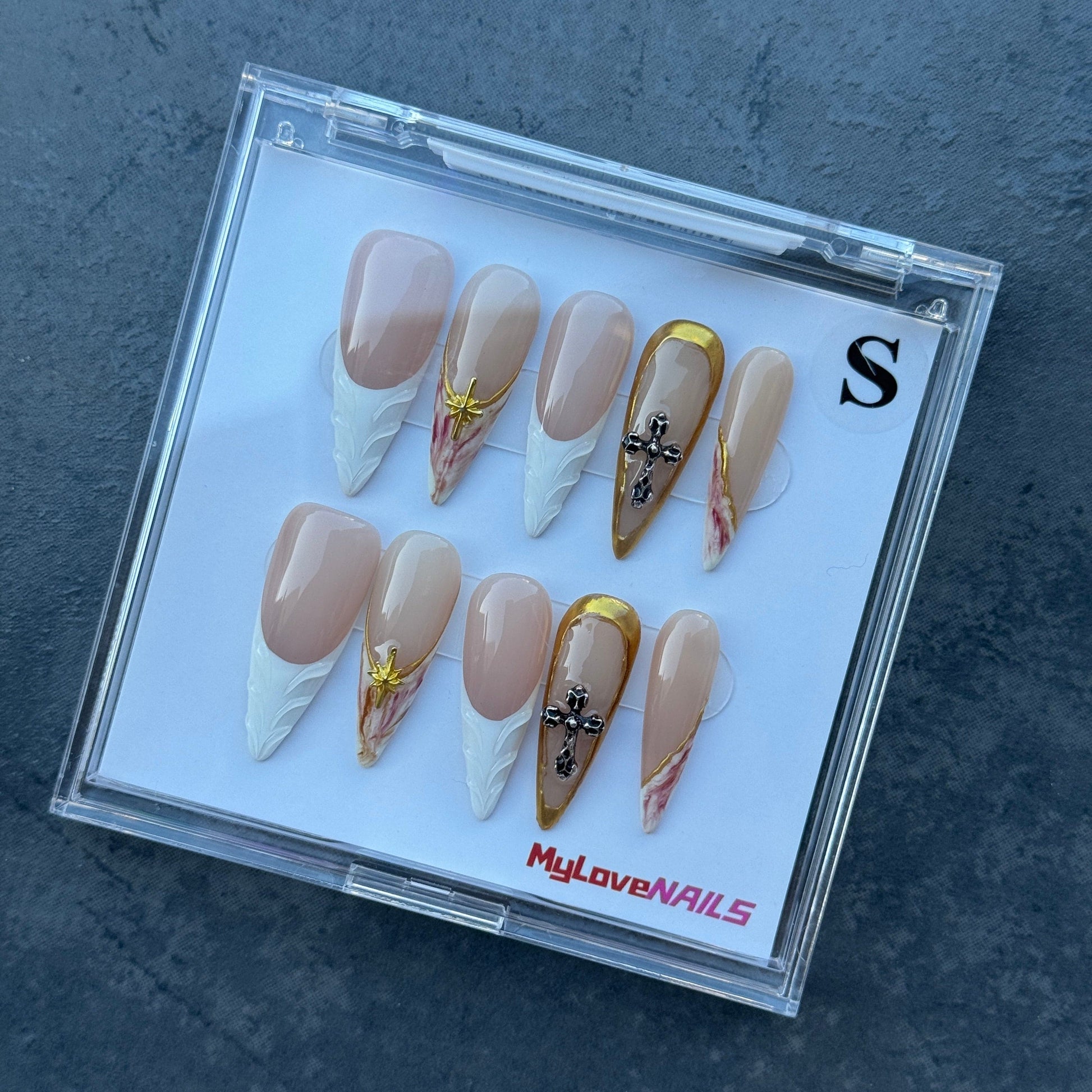 Hand made | Gold Veins (French, white, chrome, gold) press-on nails and fake nails.