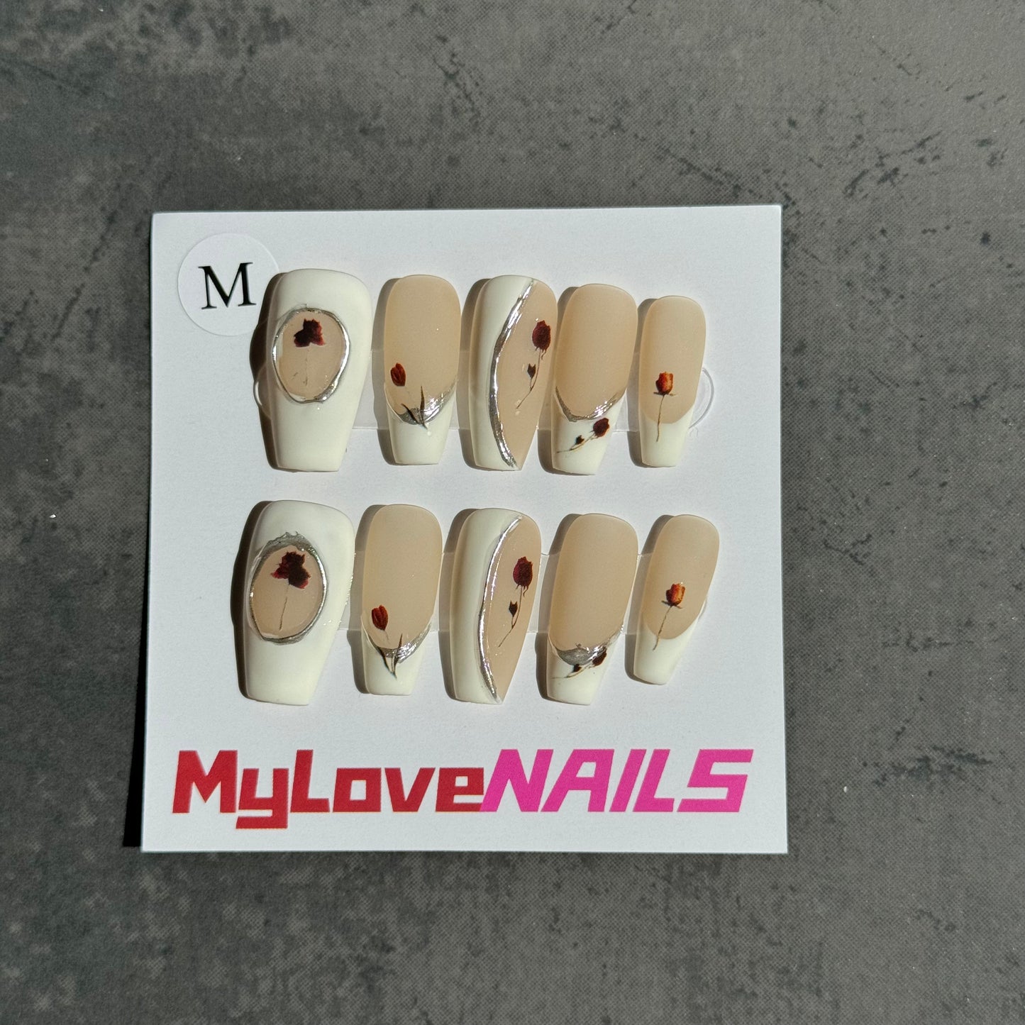 Hand made | Rose Petal (White, rose, silver lines) press-on nails and fake nails.