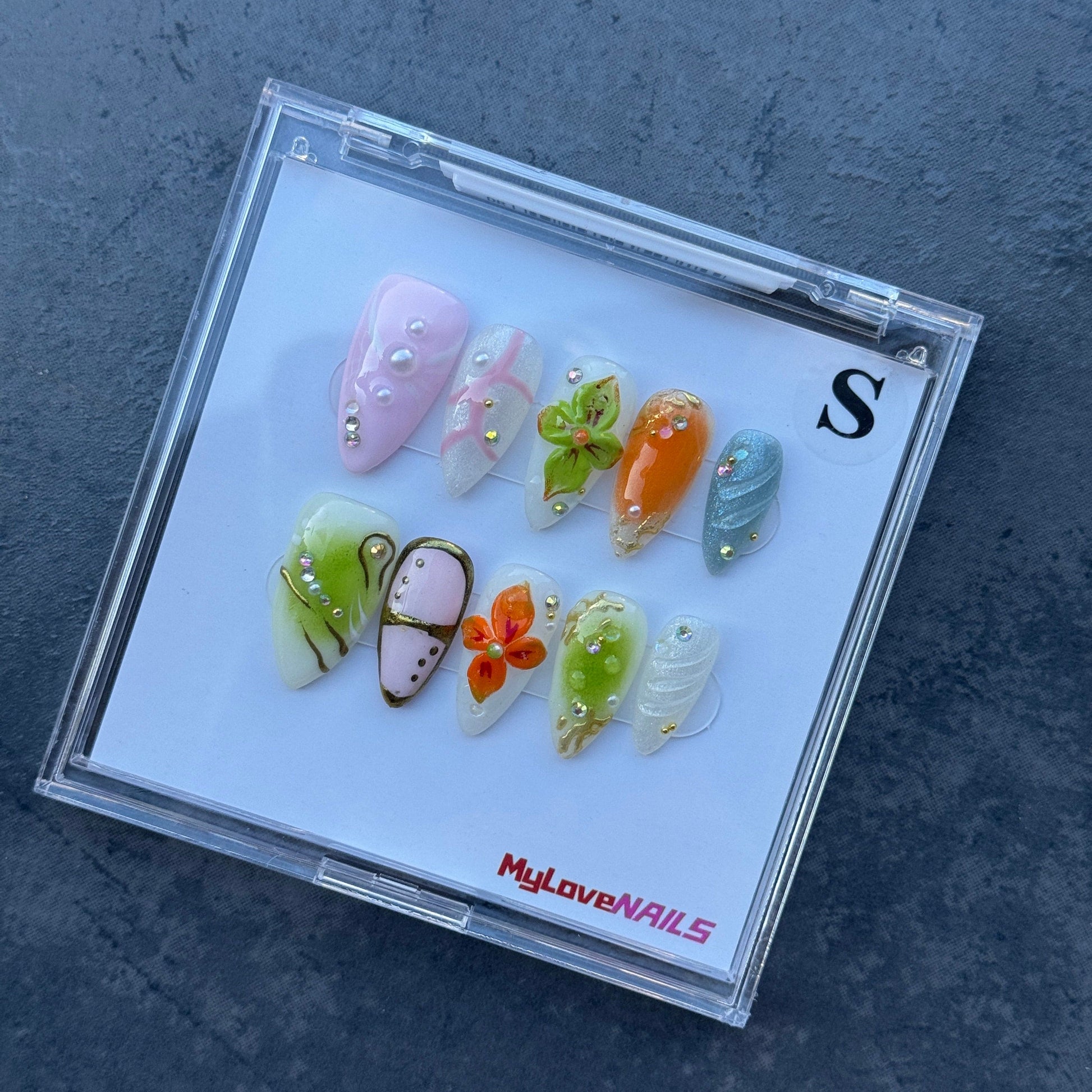 Refresh your style with the Lime Blossom press-on nails, featuring lively green and orange tones adorned with charming floral patterns. These nails bring a fresh, vibrant energy to your look while offering an easy, quick application for a flawless manicure. Perfect for adding a pop of color and natural beauty to any occasion.