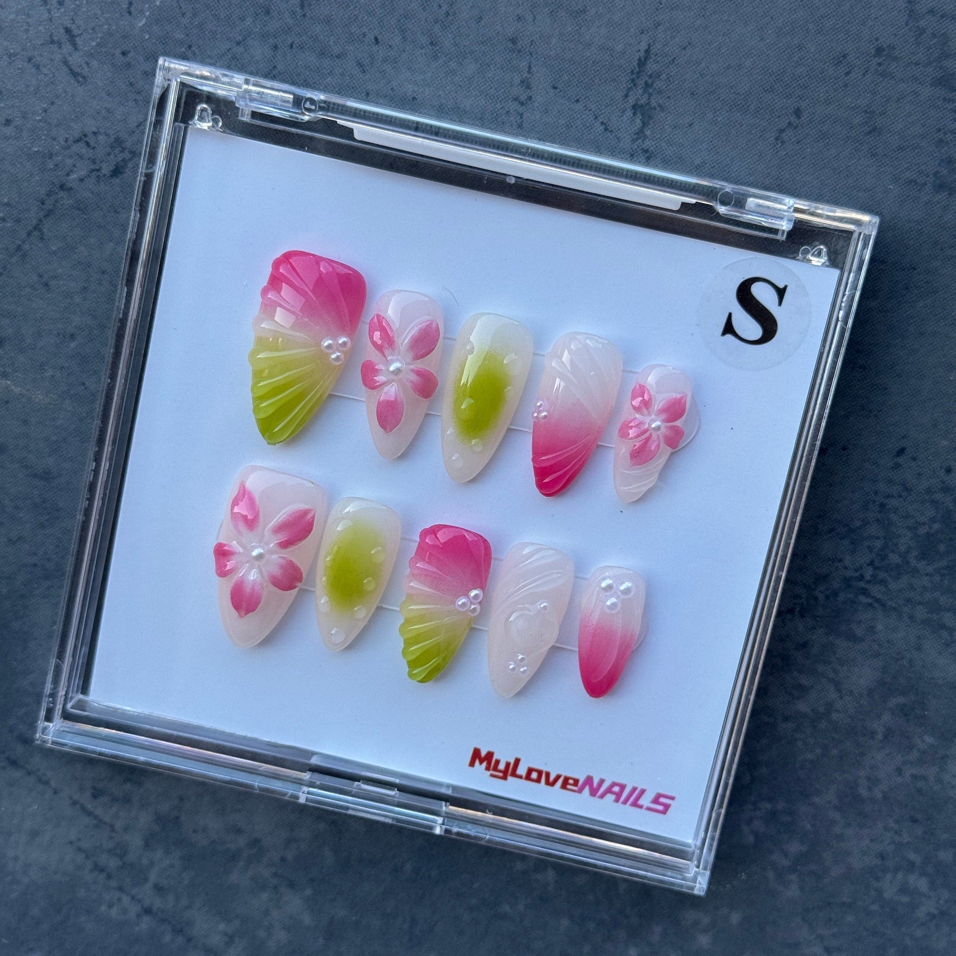 Hand made | Green Petal Flow (pink green 3d flowers gradient) press-on nails and fake nails.
