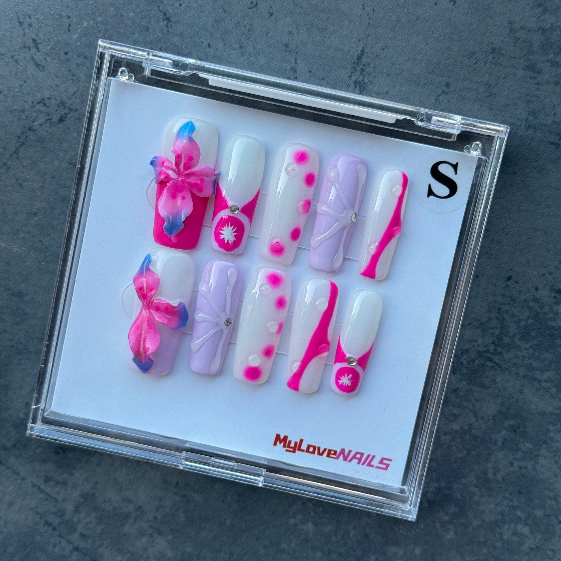Blush Lavender press-on nails blend soft lavender and vibrant Barbie pink with charming floral patterns and playful polka dots. This fun, feminine design adds a fresh, youthful vibe to your manicure, making it perfect for brightening any outfit. Easy to apply and durable, these nails deliver a stylish, salon-quality look in minutes, helping you stand out with confidence and flair.
