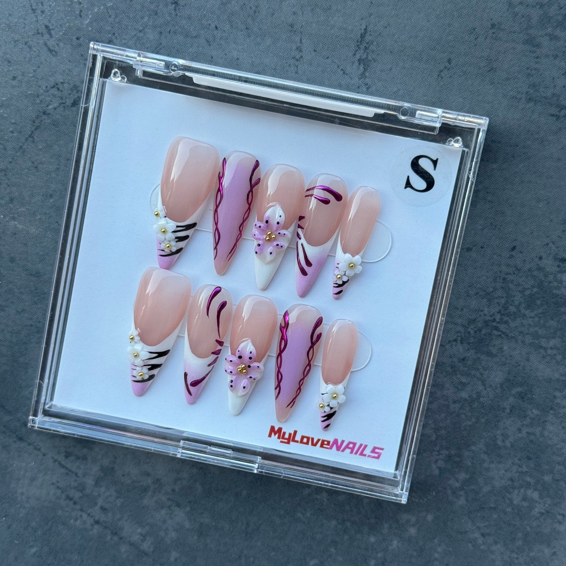 Hand made | Fleur Mauve (purple, flowers, 3D, French) press-on nails and fake nails.