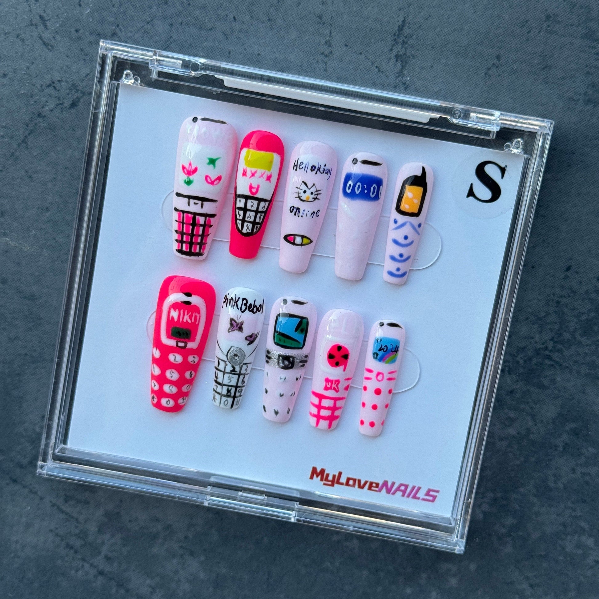 Cat Phone press-on nails feature playful pink designs with adorable cartoon cats and mobile phone motifs. Perfect for adding a fun, quirky touch to your manicure, these nails bring personality and charm to your fingertips. Easy to apply and durable, they deliver a unique, trendy look that stands out effortlessly.
