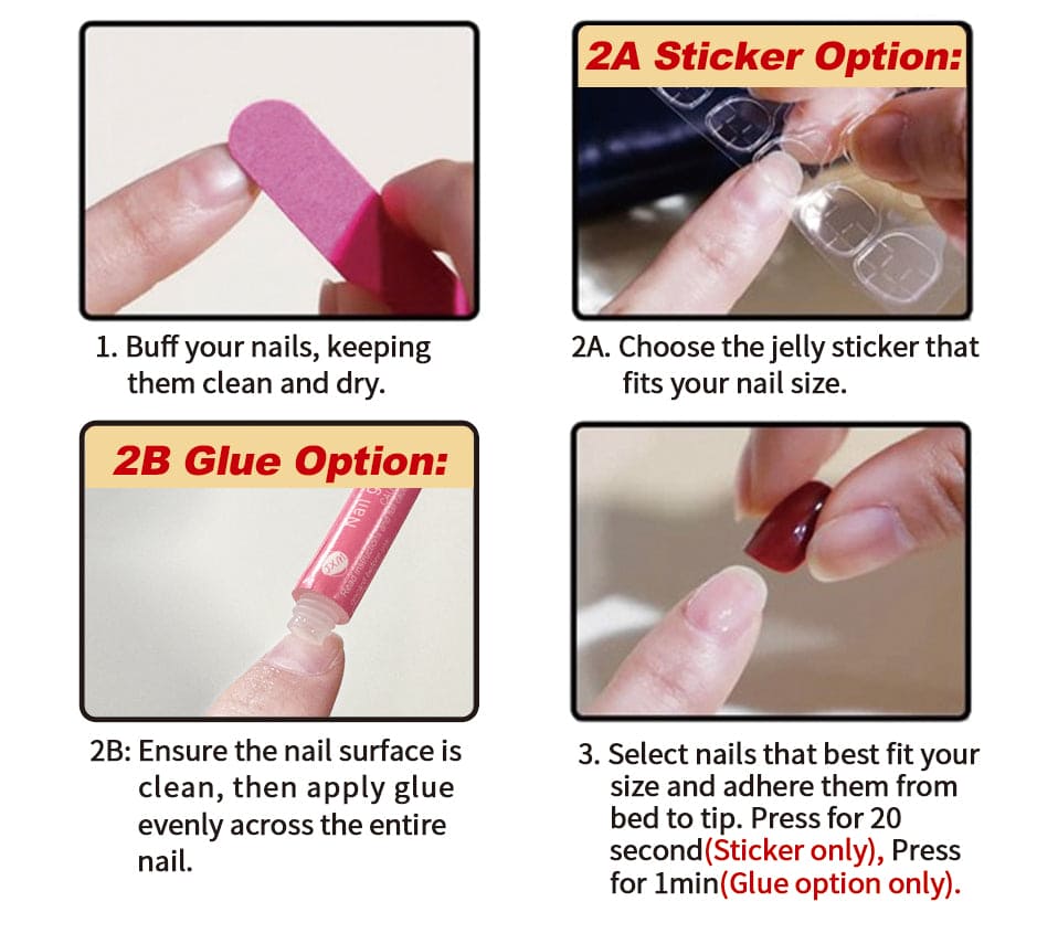 All nail orders are sent with an application pack which includes everything you'll need to apply: a cuticle pusher, nail buffer, 1 alcohol wipe, set of adhesive tabs, and liquid glue.