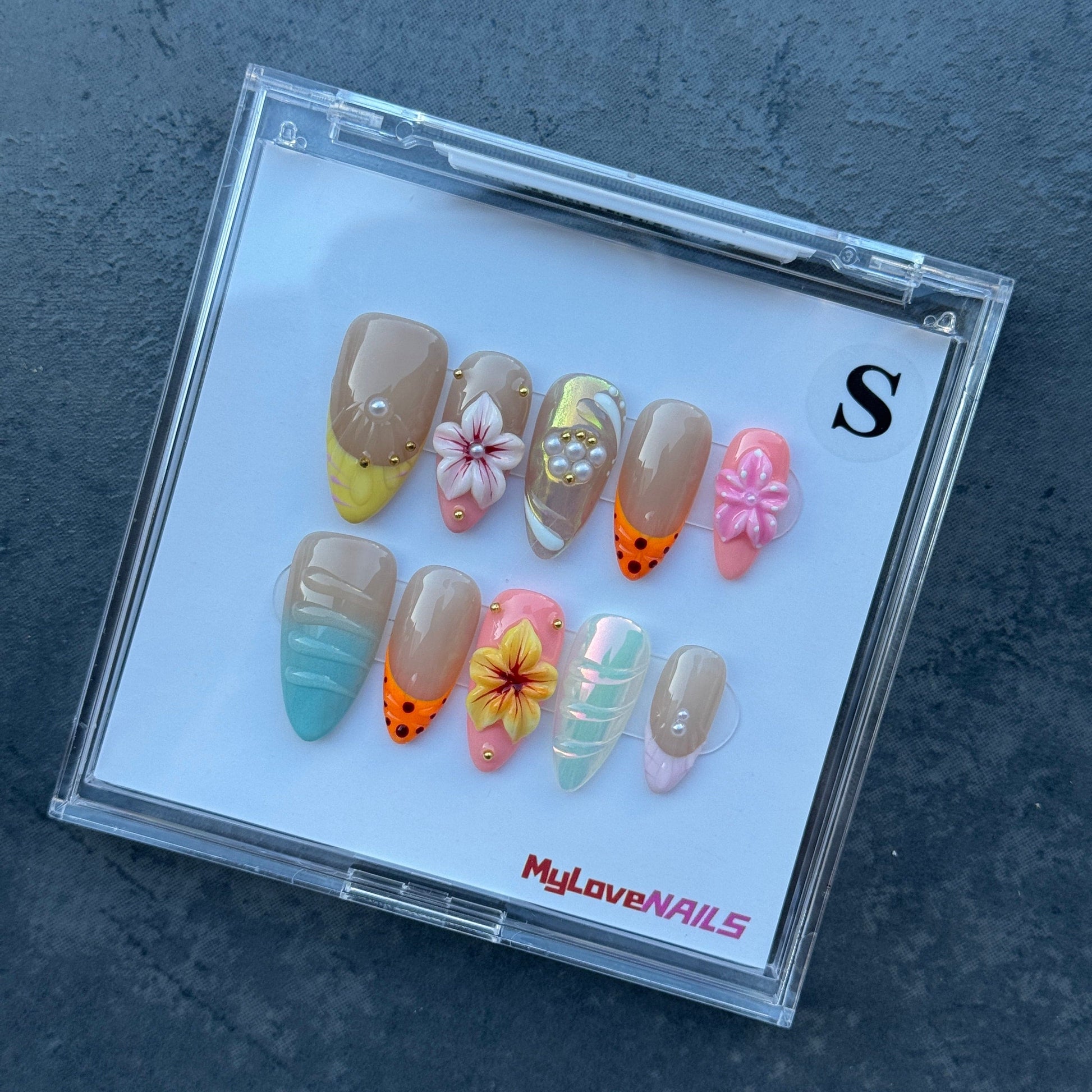 Hand made | Peach Blossom (flowers, peach, french, colorful, pink) press-on nails and fake nails.