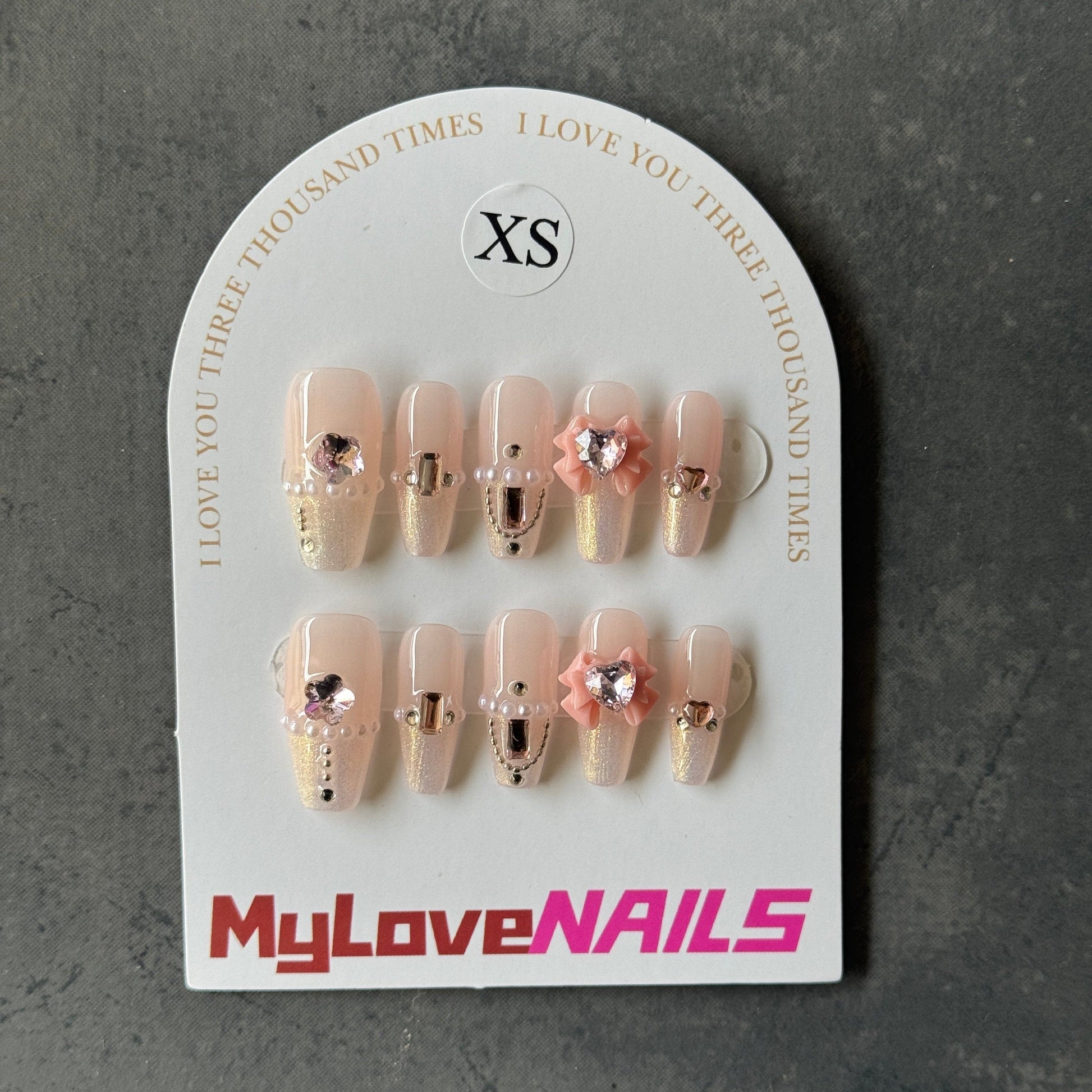 Hand made | Ella Pink Glam(Pink, bow, diamonds, cute, elegant) press-on nails and fake nails.