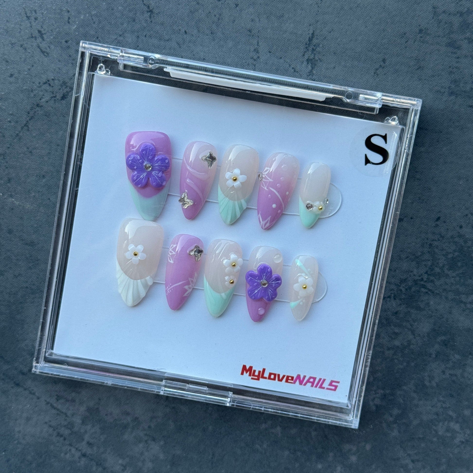 Elevate your look with Purple Elegance press-on nails, featuring a graceful blend of purple and white shades accented by delicate 3D small flowers and classic French tips. These nails combine timeless beauty with intricate detail, offering an easy-to-wear style that stands out with subtle sophistication and charm. Perfect for adding a refined touch to any outfit.