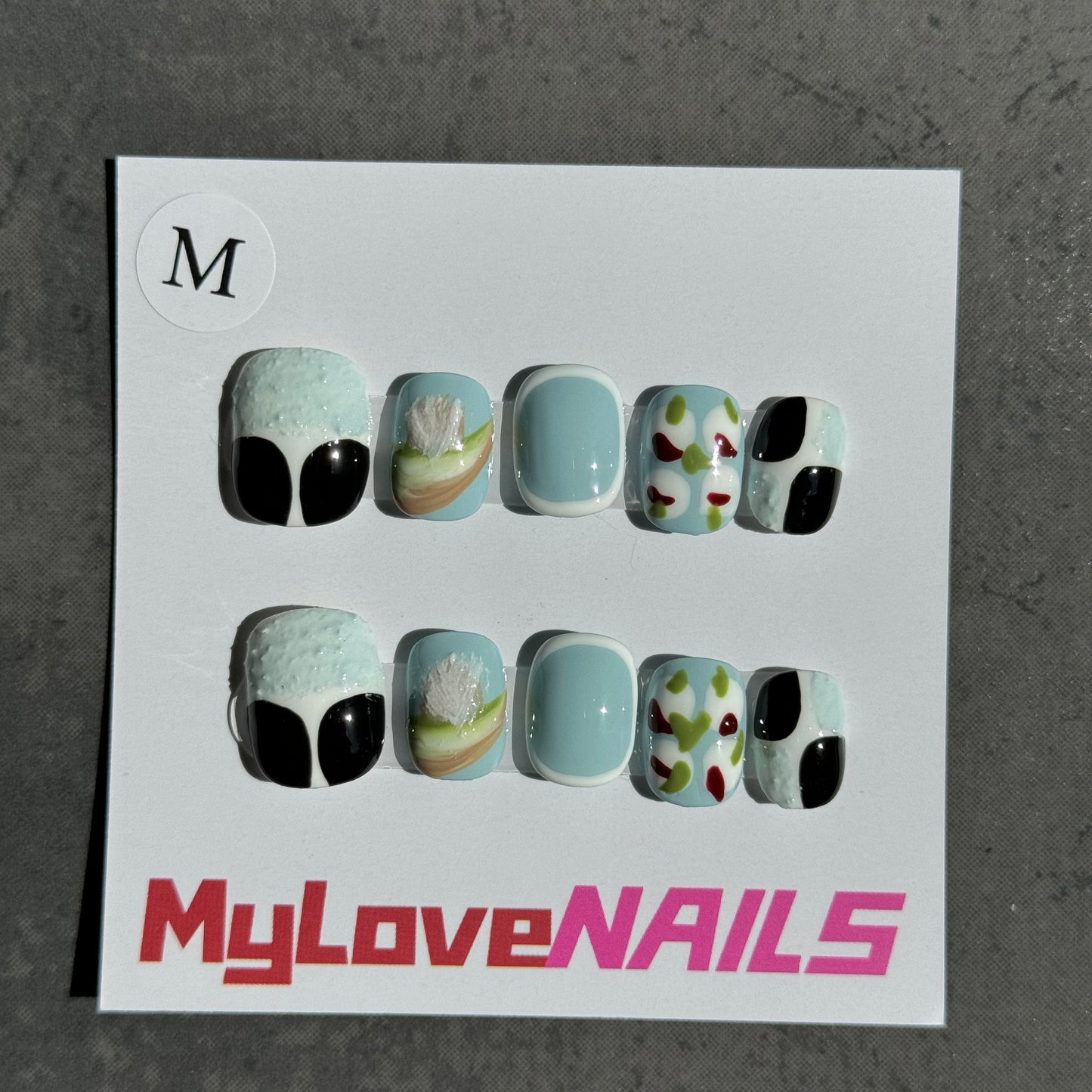 Hand made | Seed Dream (seeds, black and white, sky blue) press-on nails and fake nails.
