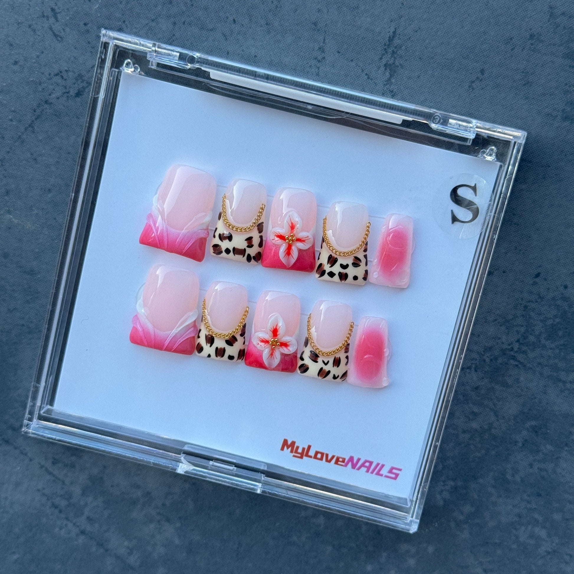 Stand out with Duckbill Blossom press-on nails, featuring a trendy duckbill shape and a bold blend of pink hues, gold chain accents, leopard print, and delicate floral designs. This striking combination adds fierce sophistication and feminine charm to your look. Easy to apply and durable, these nails deliver a unique statement style that turns heads and elevates any outfit.