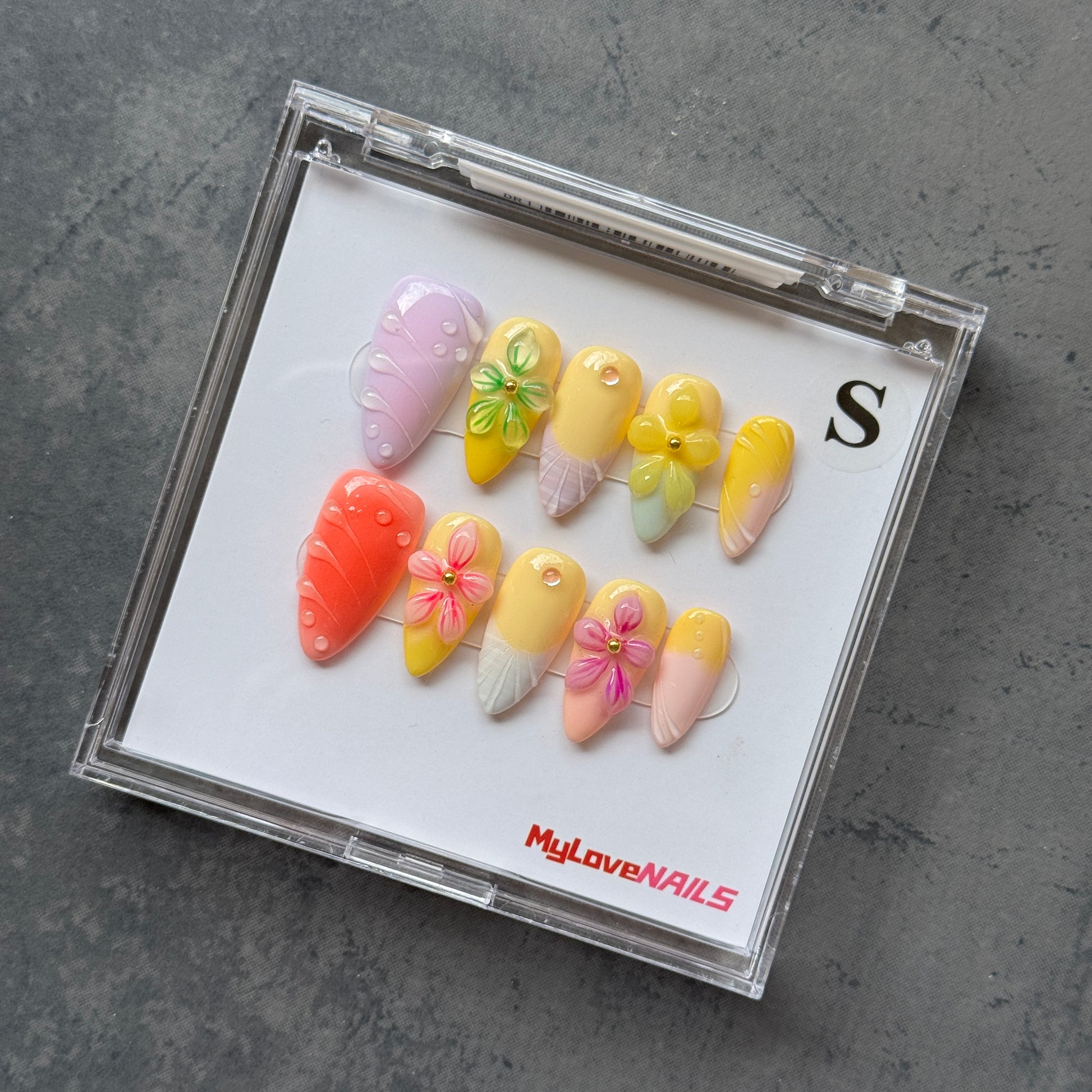 Hand made | Sunny Blossoms (Flowers, yellow, cream, white, pink) press-on nails and fake nails.