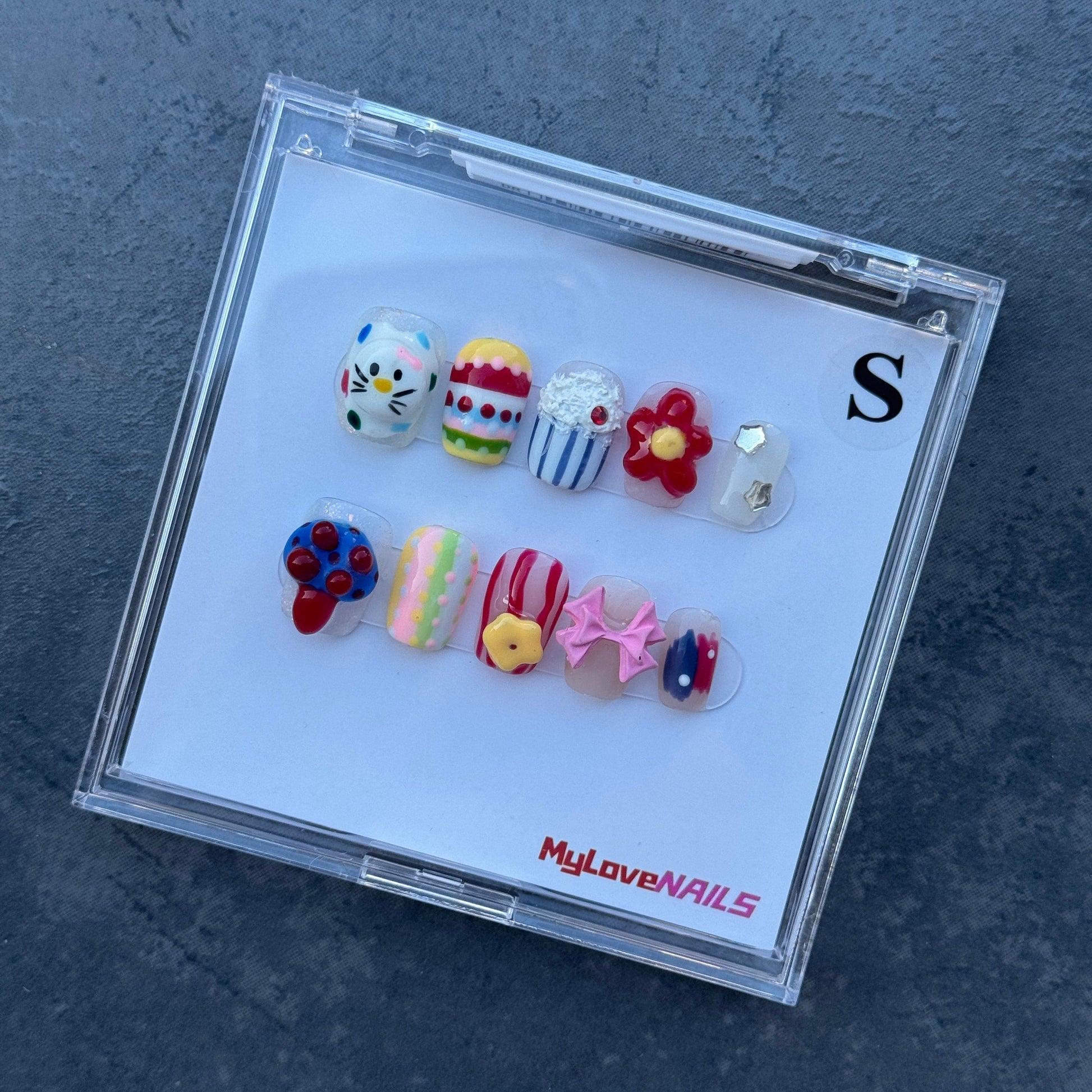Add a touch of sweetness with the Kitten Cupcake press-on nails, featuring adorable kitten and cupcake designs accented by charming little red flowers. These nails are easy to apply and perfect for bringing playful, cute vibes to your look in an instant.