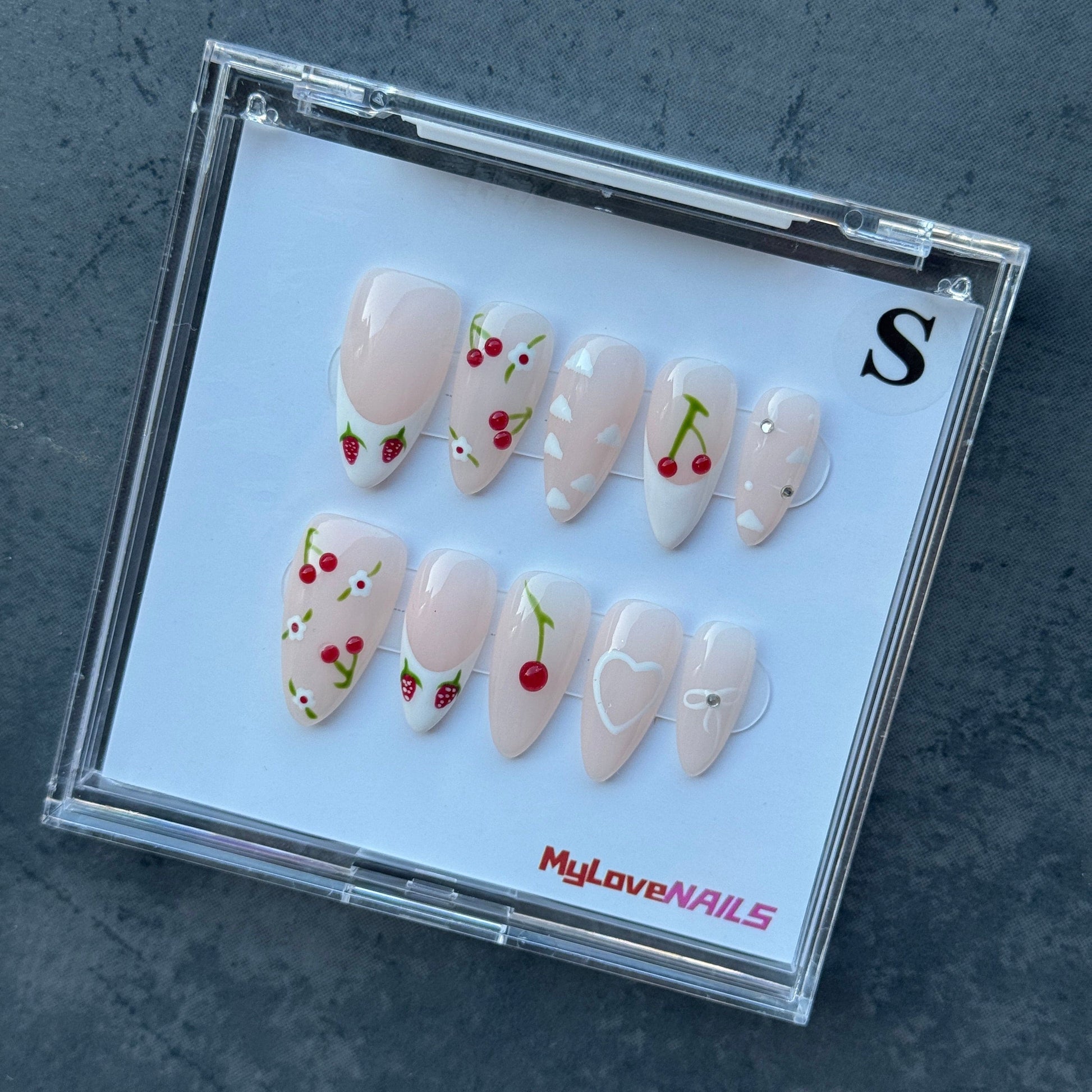 Hand made | Cherry Bliss (White, French, Cherry, Strawberry) press-on nails and fake nails.