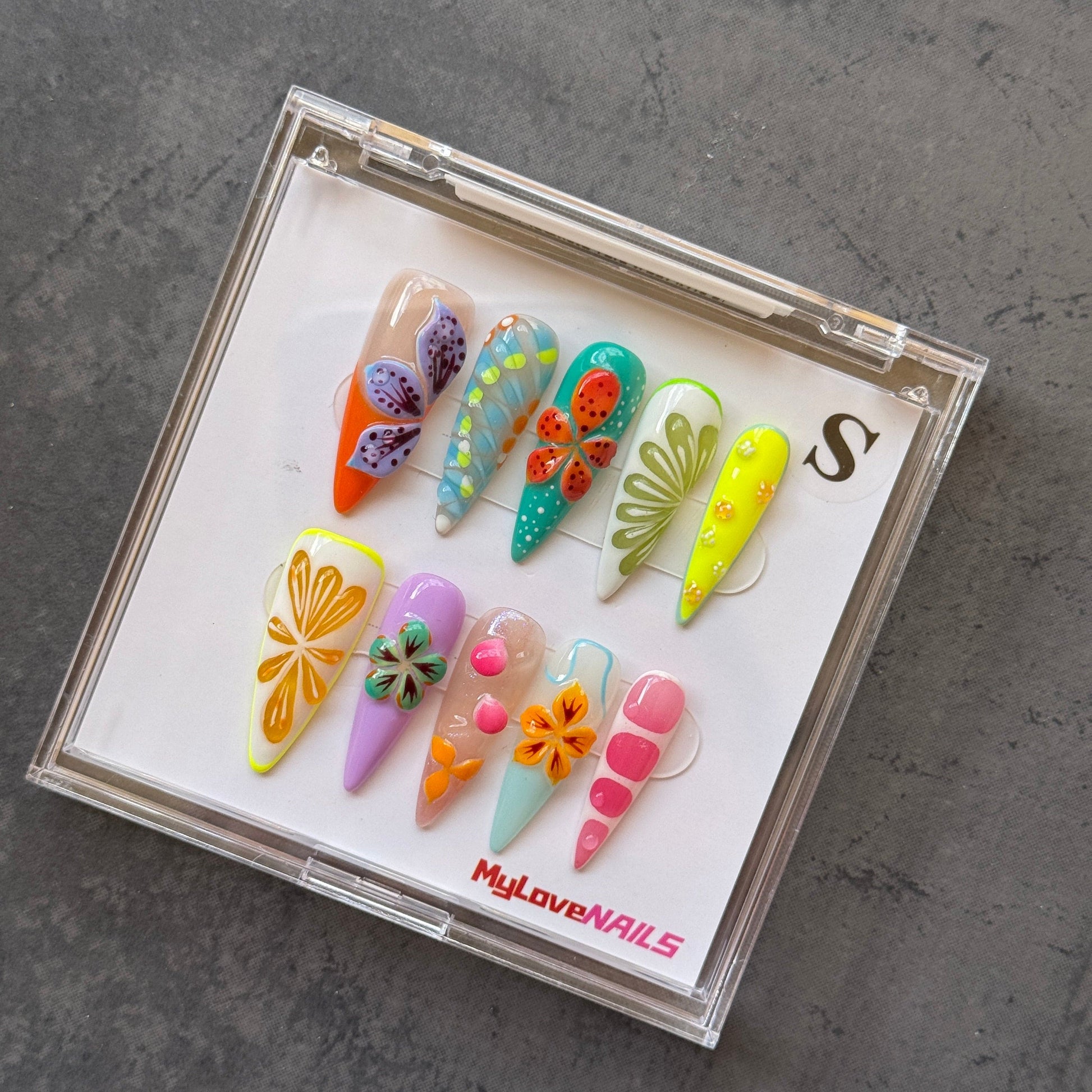 Celebrate summer with Stamens Joy press-on nails, featuring lively, colorful floral designs that capture the vibrant essence of the season. Highlighted by detailed stamens, these nails bring an energetic and joyful touch to your style. Easy to apply and perfect for brightening any look, Stamens Joy offers a fresh, eye-catching manicure in minutes.