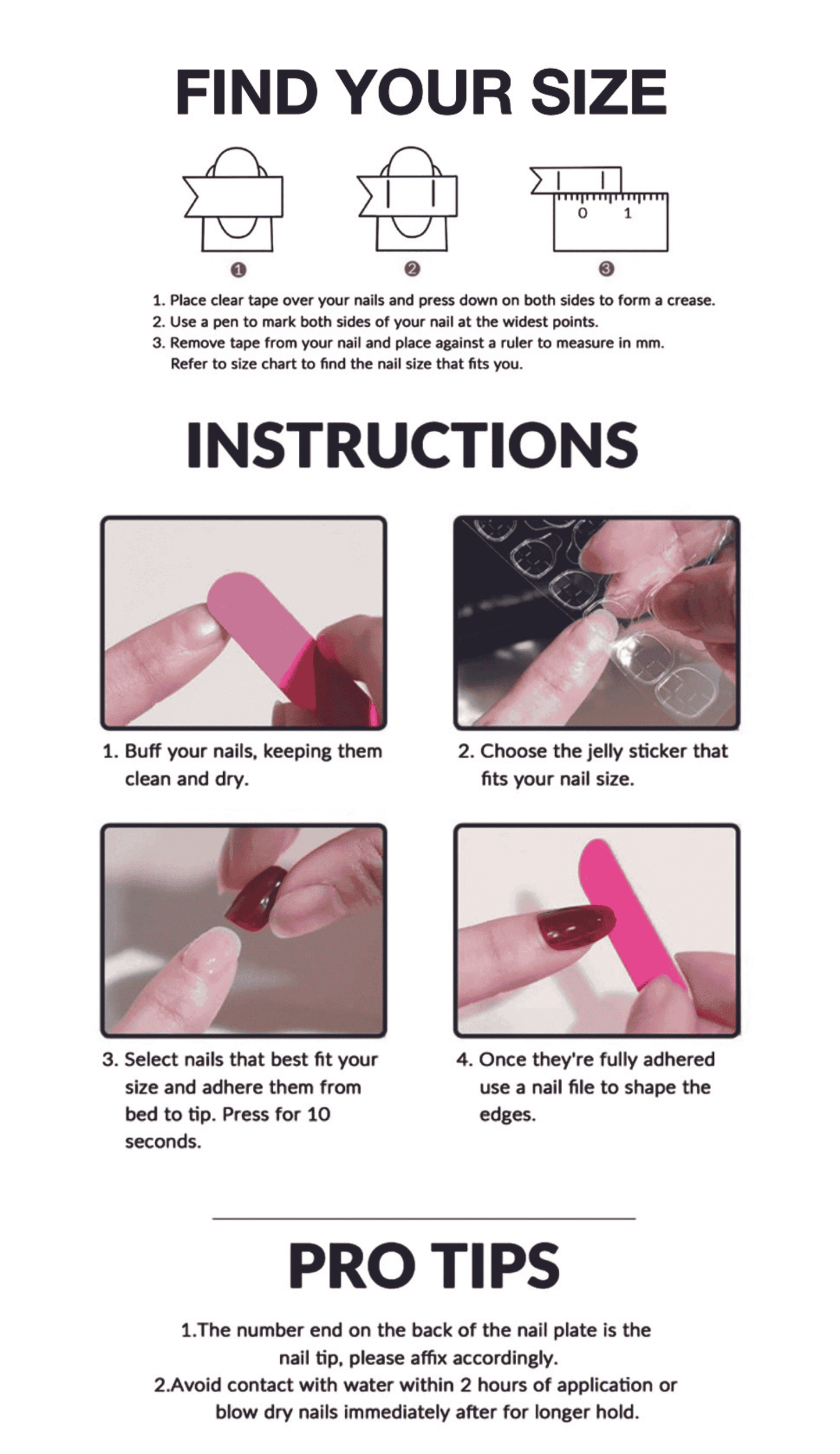 All nail orders are sent with an application pack which includes everything you'll need to apply: a cuticle pusher, nail buffer, 1 alcohol wipe, set of adhesive tabs, and liquid glue.