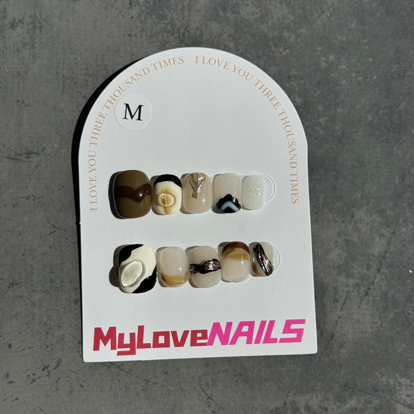 Hand made | Brown Bliss (Brown, white, black) press-on nails and fake nails.
