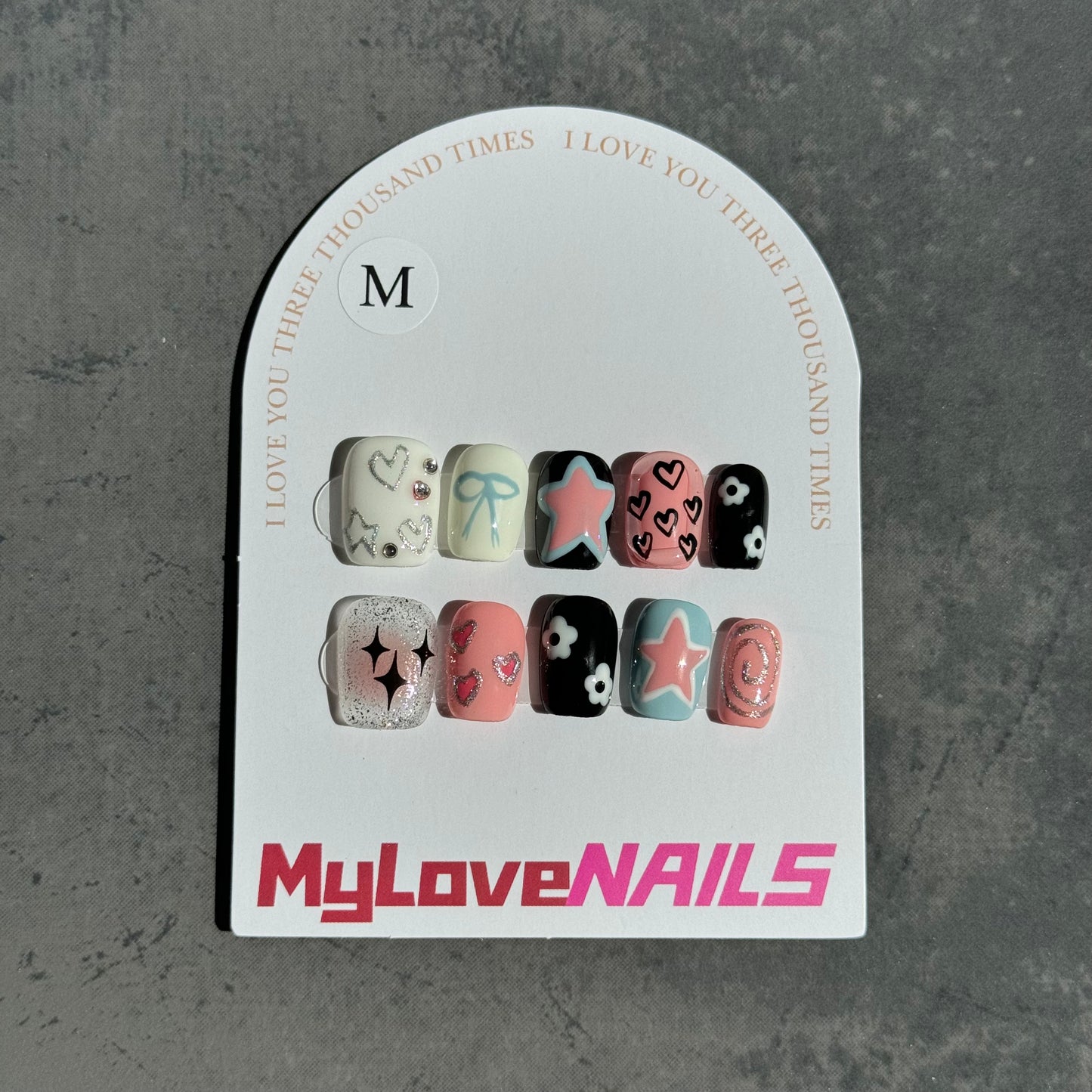 Transform your nails into a dreamy starry love with these press-on nails. With a love heart, pink, black, and stars design, these nails will make you feel confident and stylish. Ditch the hassle of traditional nail polish and achieve a perfect manicure in minutes!