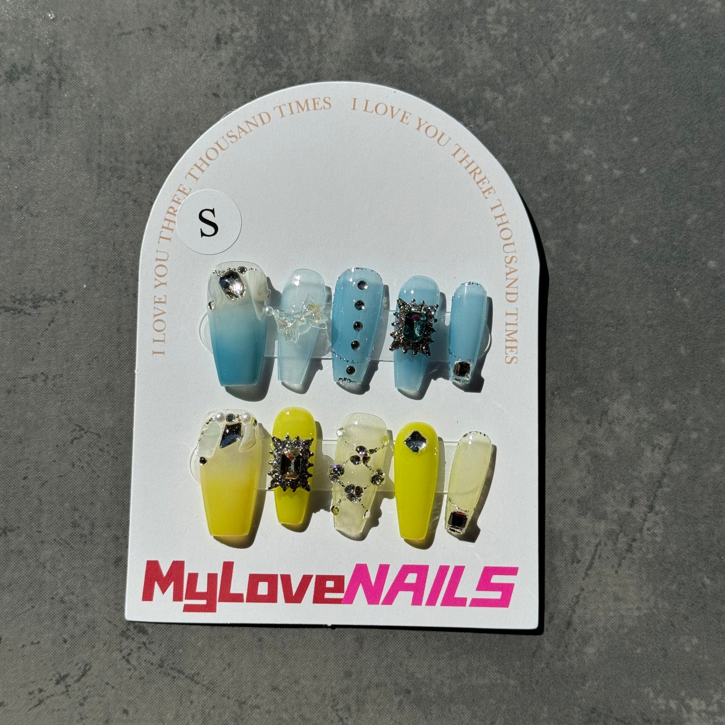 Hand made | Dual Radiance (Young, cyan, bright yellow, double spell) press-on nails and fake nails.