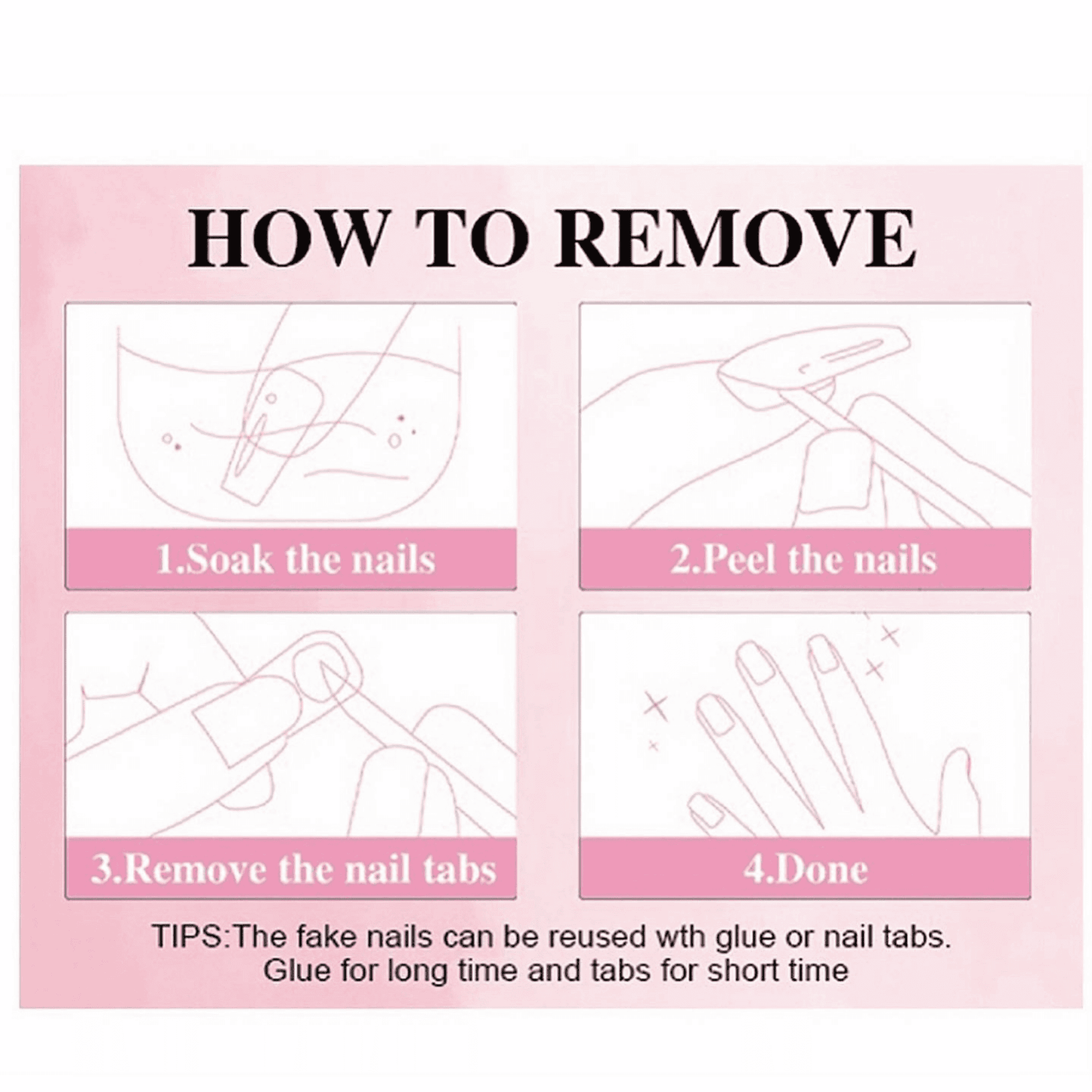 All nail orders are sent with an application pack which includes everything you'll need to apply: a cuticle pusher, nail buffer, 1 alcohol wipe, set of adhesive tabs, and liquid glue.