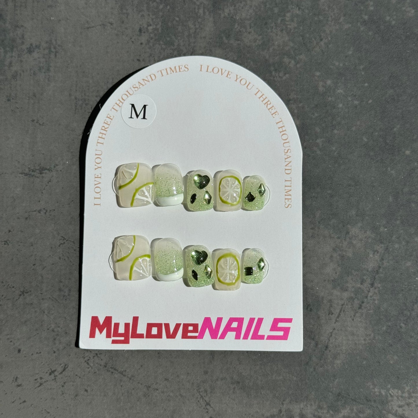 Hand made | Lemon Delight (green, lemon, cat's eye) press-on nails and fake nails.