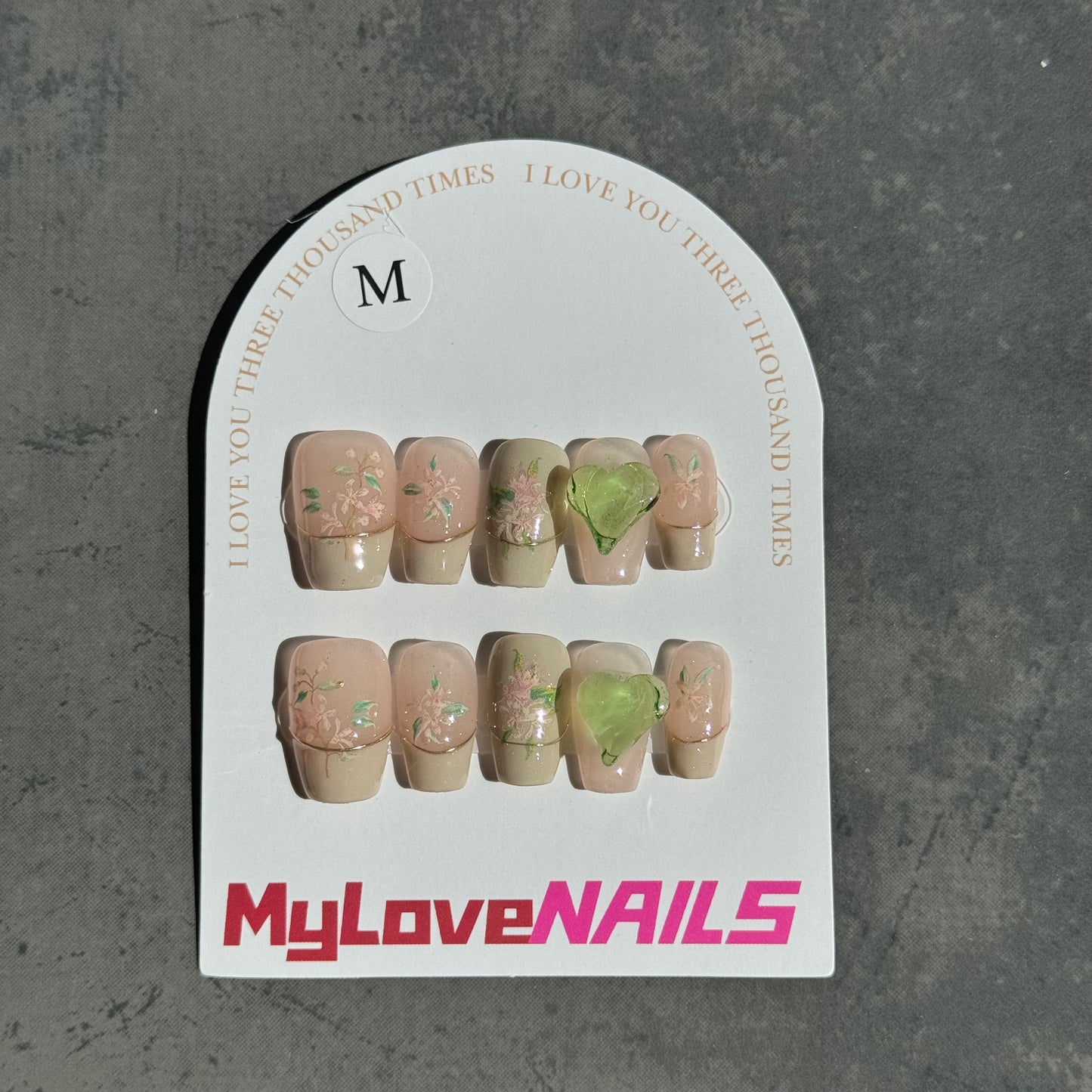 Hand made | French Greens (flowers, french, green, diamonds) press-on nails and fake nails.