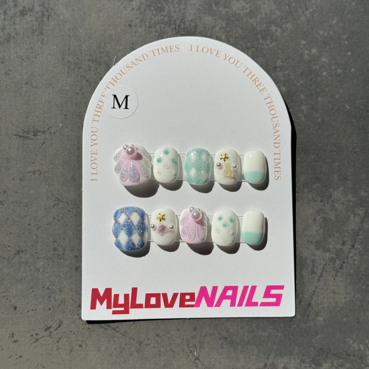 Transform your nails into a serene oasis with Scallop Serenity. These press-on nails feature beautiful shades of pink, sky blue, and cyan with delicate scallop and pearl designs. Get salon-worthy nails in minutes and elevate your style with our hassle-free and long-lasting press-on nails.