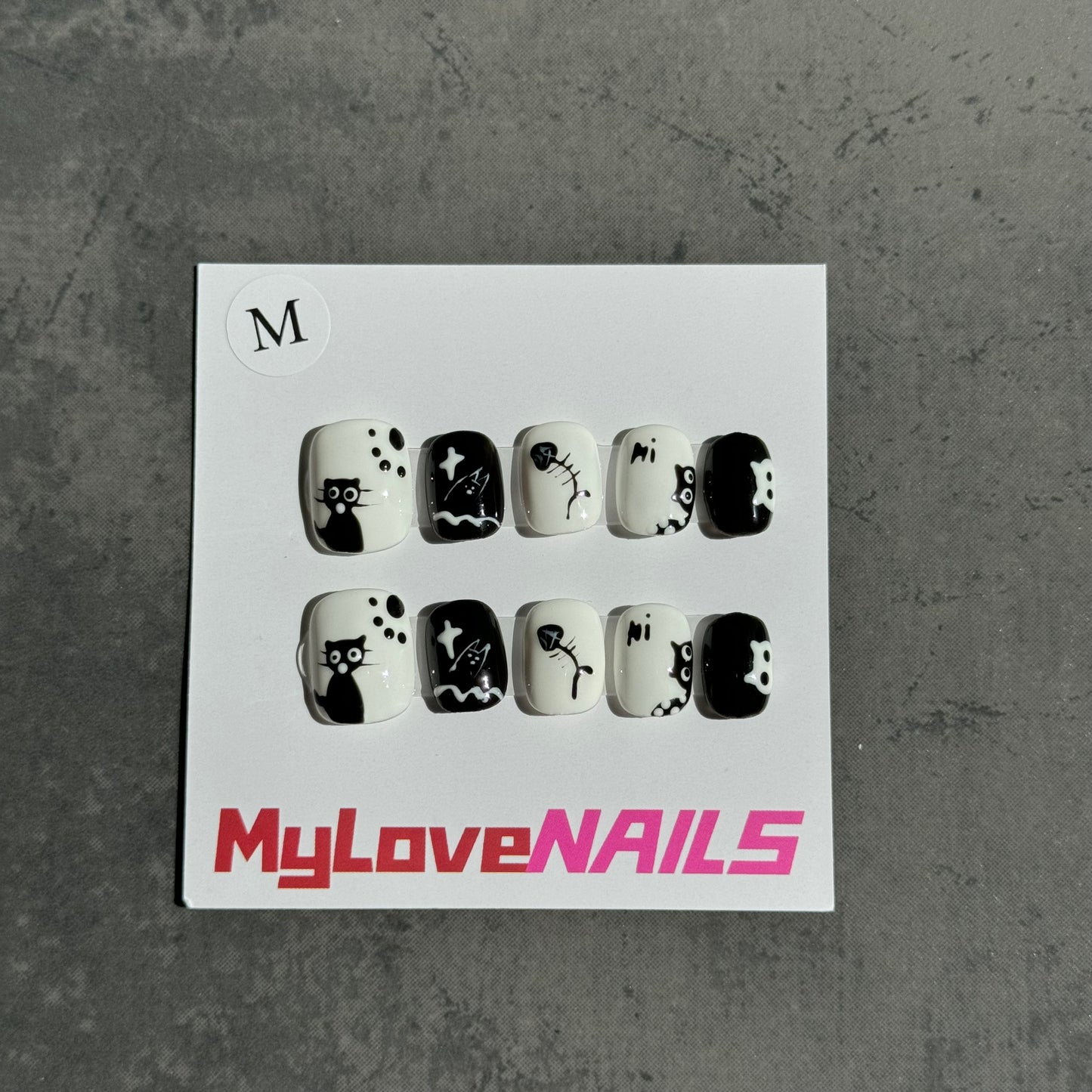 Hand made | Cat Cuisine (white, black, cat, food) press-on nails and fake nails.