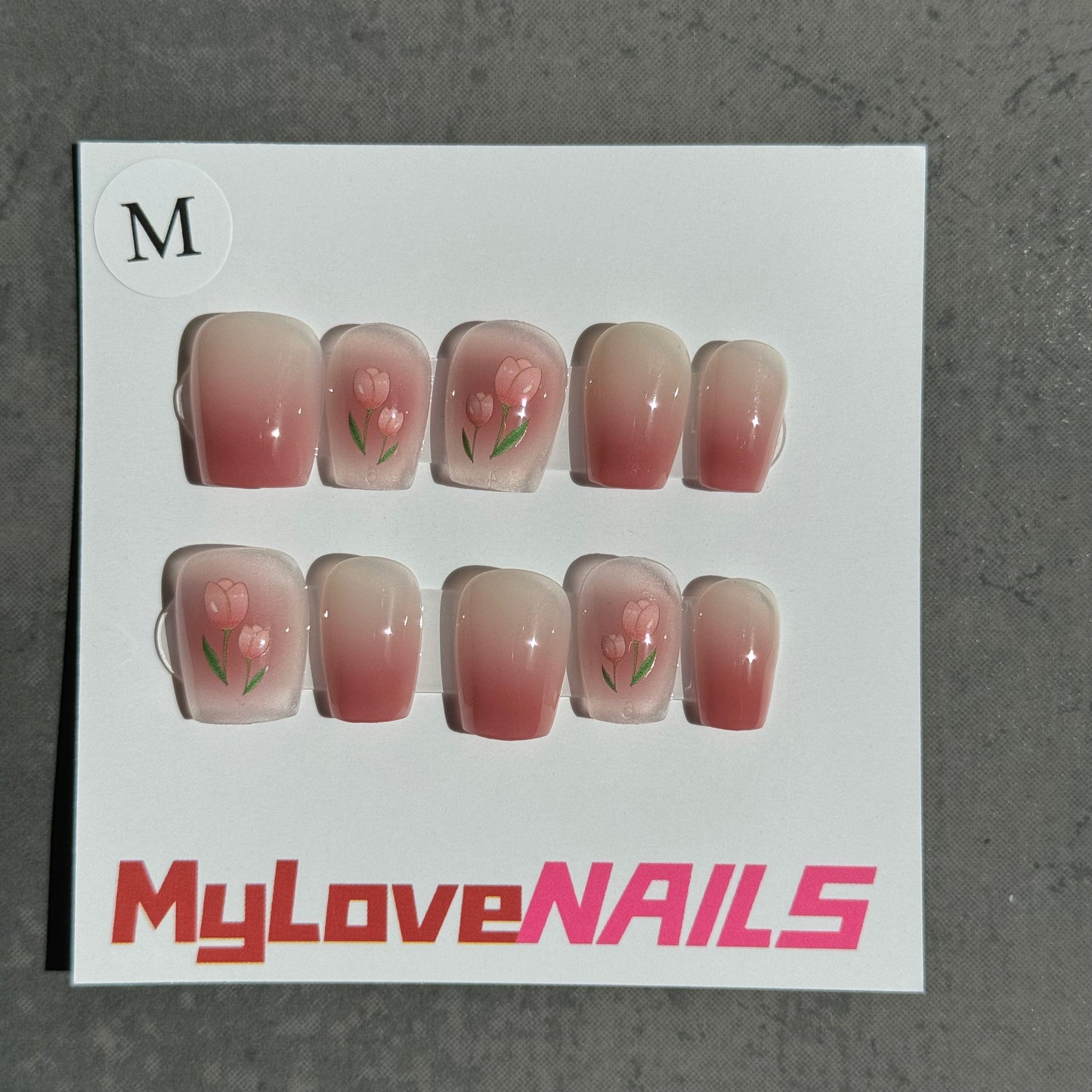 Hand made | Rose Harmony (Flowers, pink rose bloom, gradient) press-on nails and fake nails.