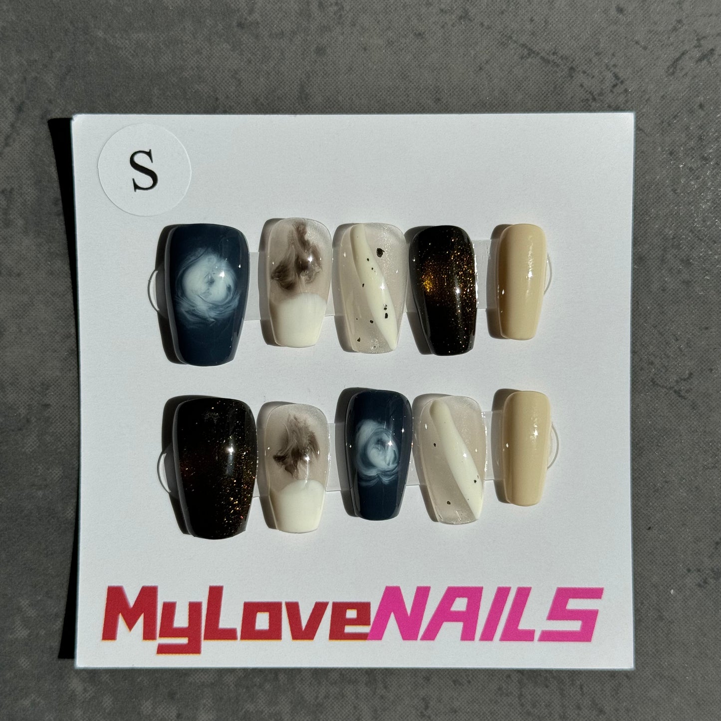 Hand made | Galaxy Swirl (Swirl, black starry sky, white) press-on nails and fake nails.