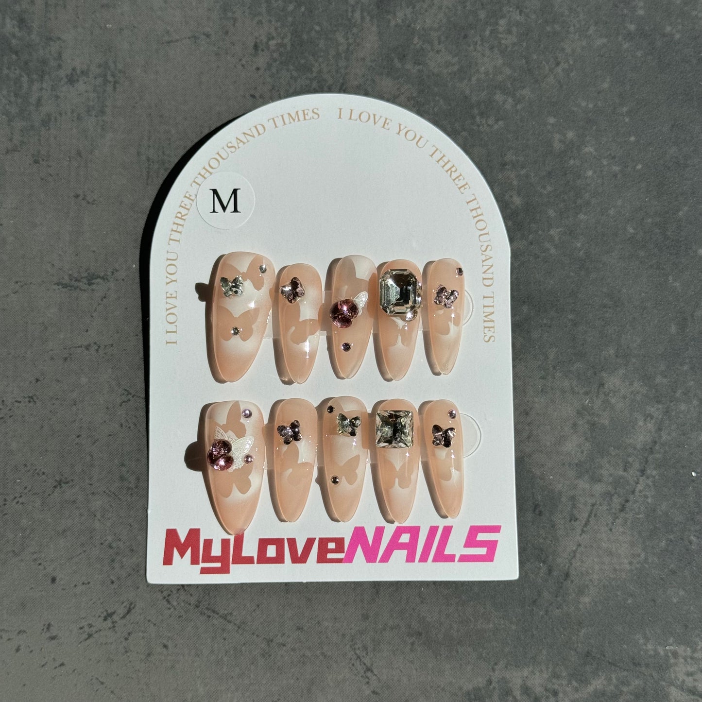 Hand made | Butterfly Jewel (butterfly, diamond, skin color) press-on nails and fake nails.