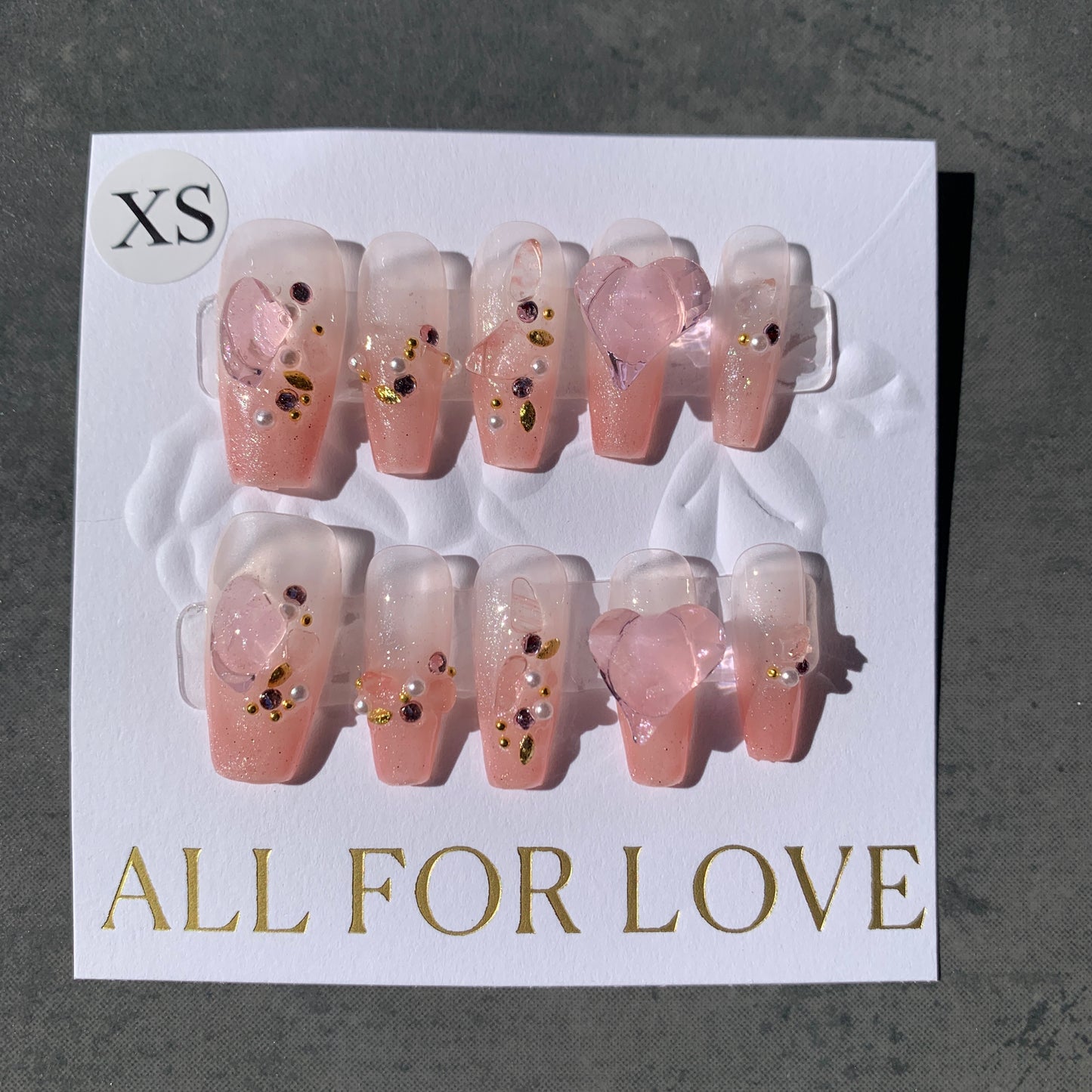 Hand made | Cure Heart Elegance(heart, pink, pearl) press-on nails and fake nails.