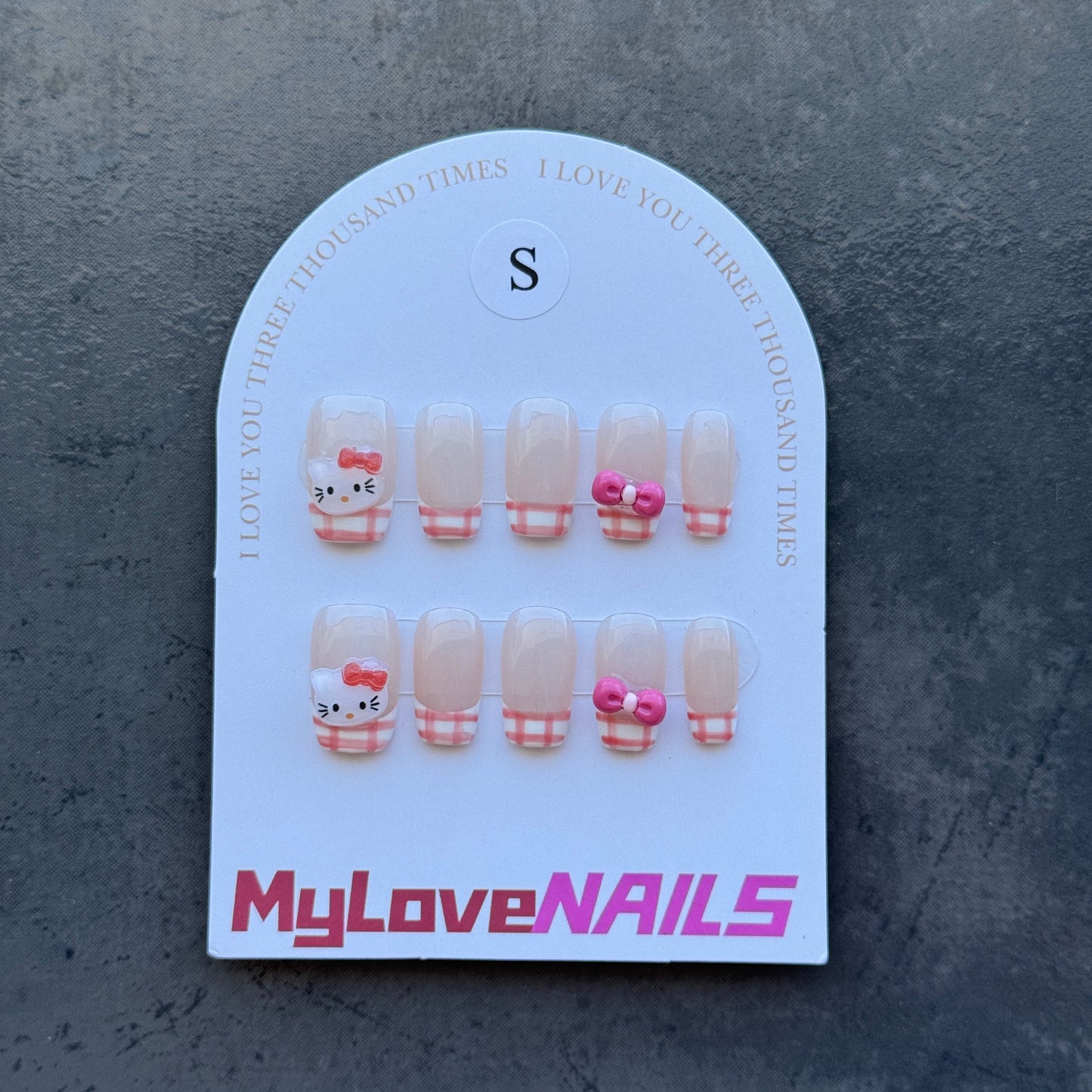 Hand made | Kitty Bow (French plaid, pink, kitty cat, bow) press-on nails and fake nails.