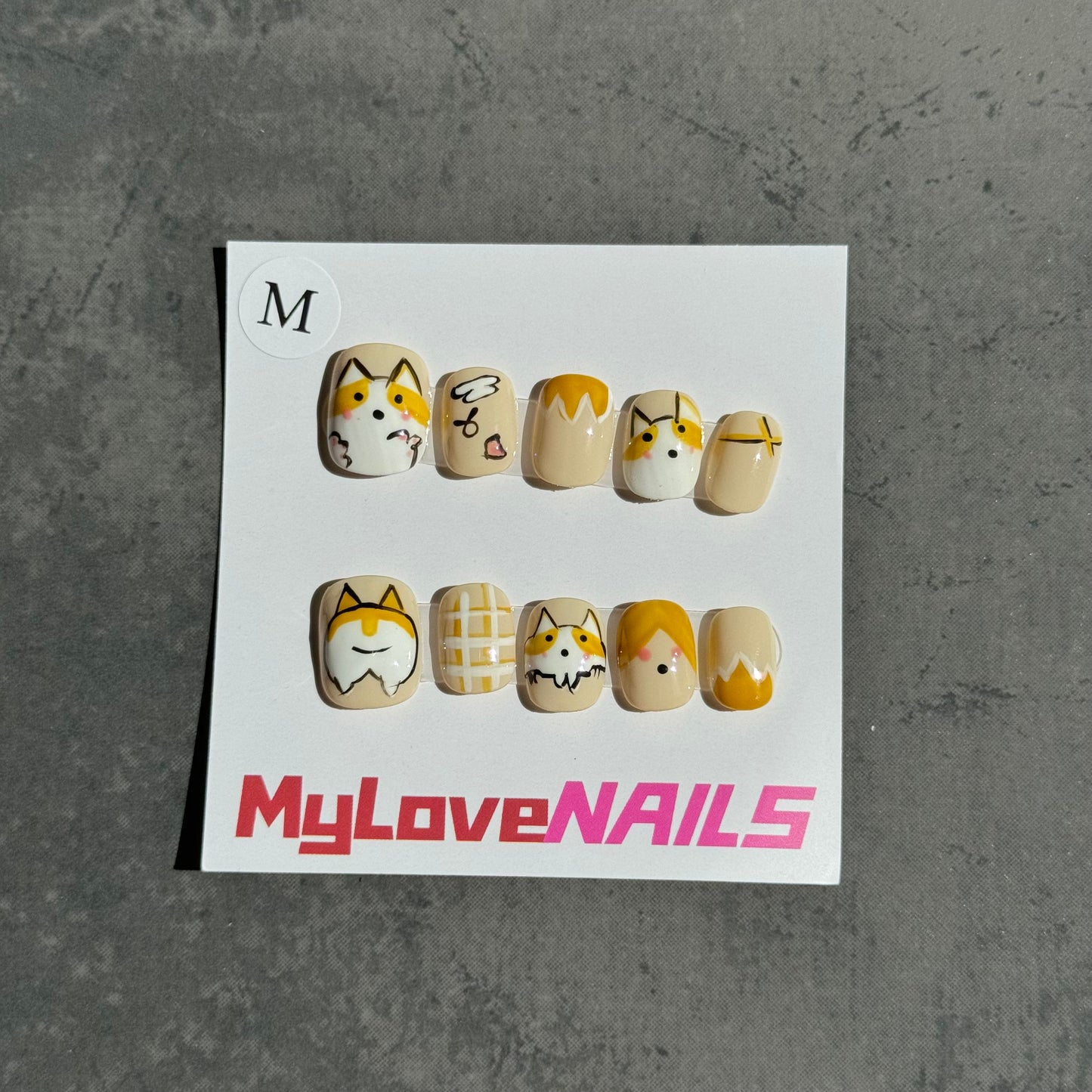 Hand made | Corgi Cheese (yellow, corgi, grid, cheese) press-on nails and fake nails.