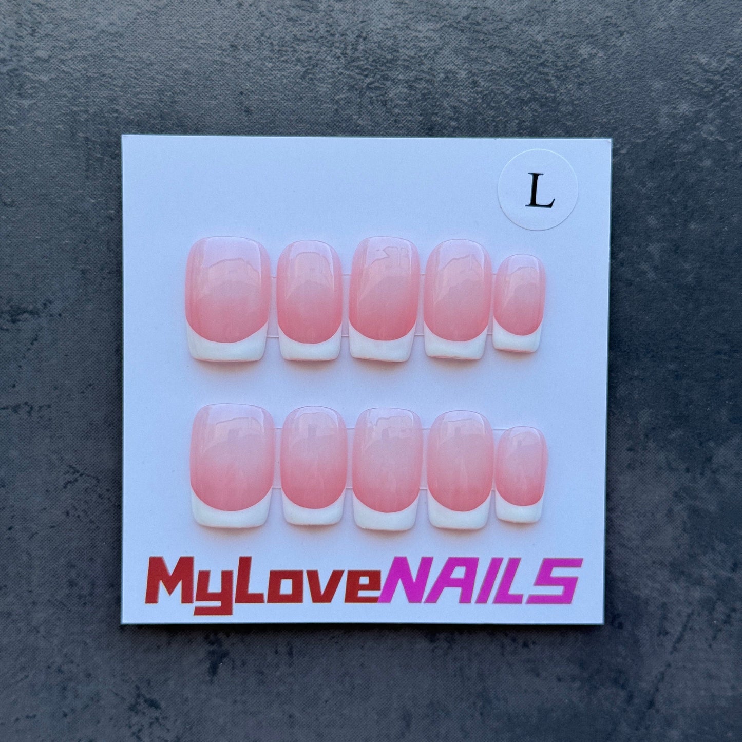 Hand made | Blush Dream (Small French, white, gradient pink) press-on nails and fake nails.