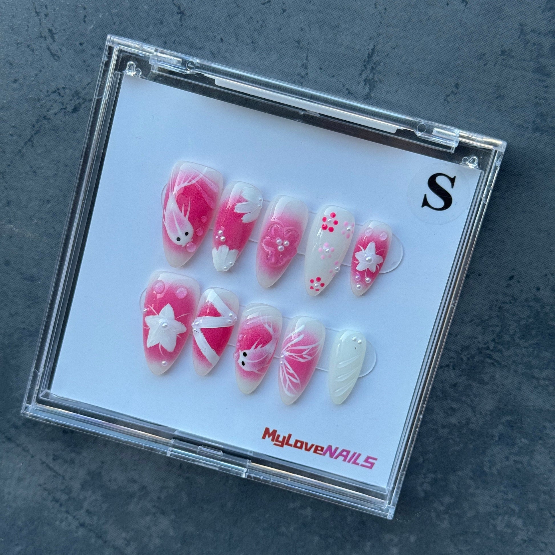 Hand made | Pink Fin (Pink, fish, white, gradient) press-on nails and fake nails.