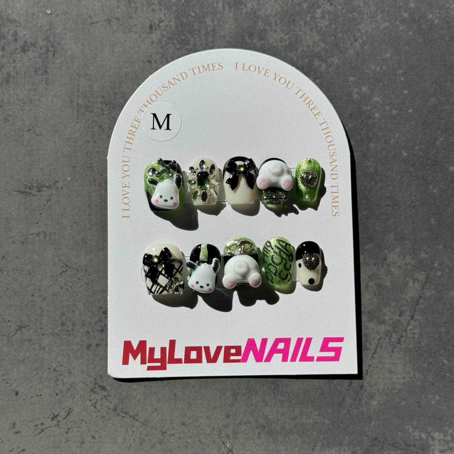 Hand made | Puppy Ribbon (Cute puppy, green, bow tie) press-on nails and fake nails.