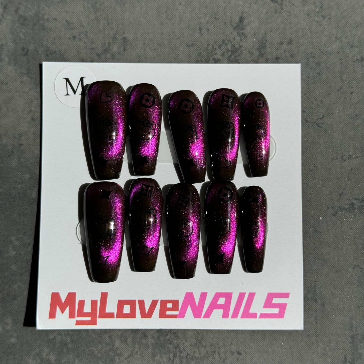 Hand made | Kitty Gaze (kitty, black and purple cat eyes, starry sky) press-on nails and fake nails.