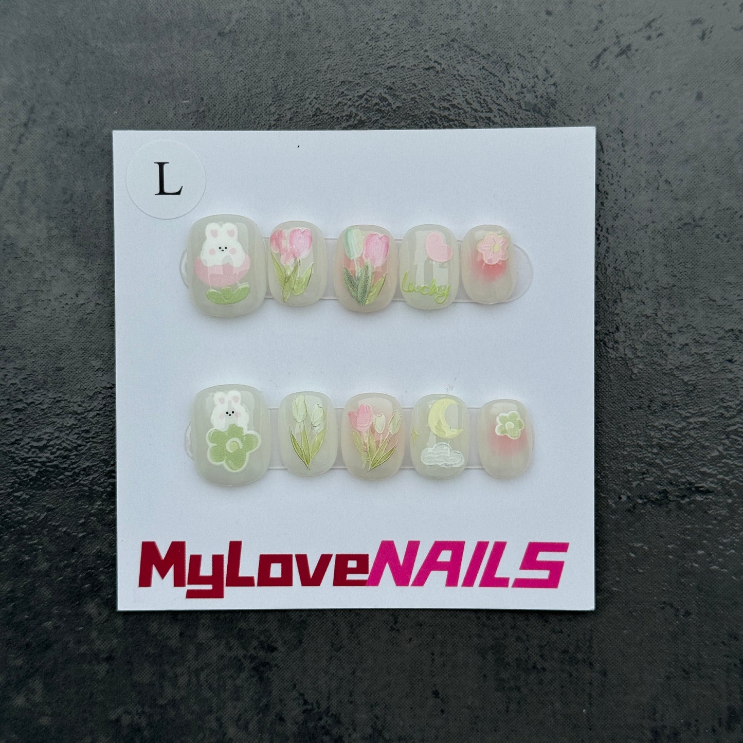 Hand made | Graceful Blooms Delight(Transparent white, small flowers, little rabbits, cute) press-on nails and fake nails.