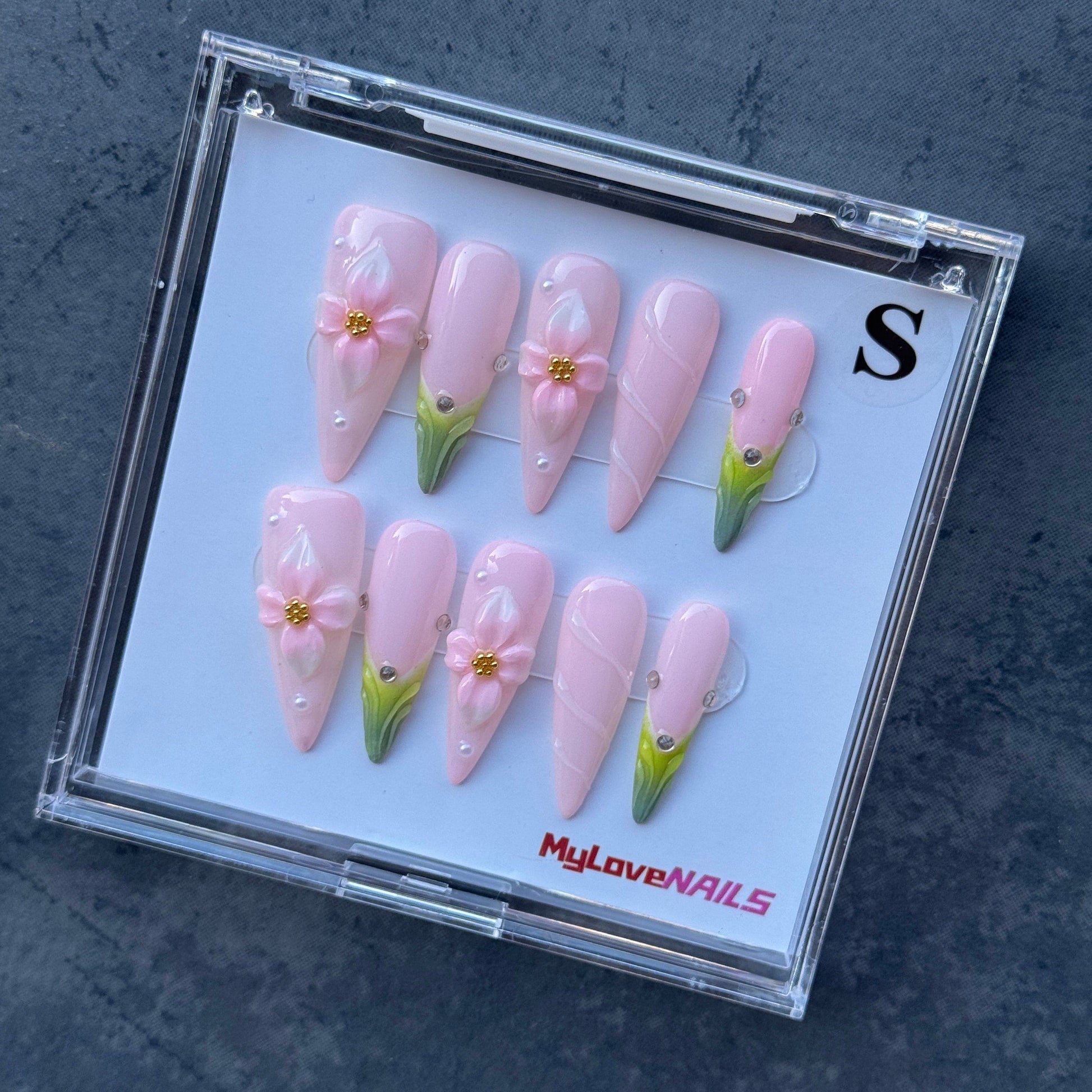 Hand made | Pink Stamens (Flowers, pink, French, green, golden stamens) press-on nails and fake nails.